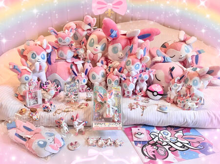 "There's a Galarian fairy tale that describes a beautiful Sylveon vanquishing a dreadful dragon Pokémon."My biggest collection, an ongoing project for many years, started before I even knew! She chose me in the form of a lucky badge in a packet of cookies I bought from a Tokyo Pokémon Centre in 2013, and again when my dear friends used a Sleeping Case Sylveon to represent me on a reunion I could not join them on in 2021. After that I decided to consciously collect her. I have a lifelong love for Pokémon, and she is the star of that show.Sylveon compels me, her rose and aqua colours are my favourite, she reminds me of all the people near and far who love me (and I them) when I look at her, especially those items acquired from or with them. She is also my artistic muse, always dancing onto my canvas with ease. Many of my illustrations feature her, I am honoured to draw some of the internet’s favourite Sylveon art.Most of this collection is in storage at the moment, but a few are out for me to admire, most notably my Life Size Sylveon. One day they will all be reunited in a dedicated display space in my future home!I dream of owning (or making) more Shiny Sylveon customised merchandise- she is my signature Pokémon. I already have one, a painted Kids Figure, who I'm very fond of and like to take on little journeys. She will continue sitting on my bedside table until the day I have a special shelf full of twinkling blue Sylveon figures and plushes that she can pose alongside.✧return- - - - - - - - - - - - - ⚜ - - - - - - - - - - - - -