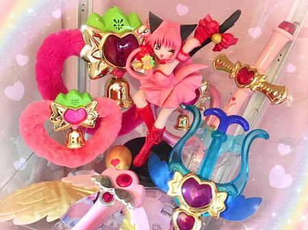 "For the future of the Earth, we'll be of service, nya!"My very first exposure to the magical girl genre was via Mew Mew Power, TMM’s English dub, on TV, and I have been hooked since. TMM remains one of my favourite series to this day. Mia Ikumi, the artist who designed and illustrated the manga, tragically passed away in 2022, however her works continue to touch the hearts of magical girl fans across the globe, myself included.It was young Sol’s dream to own the Strawberry Bell toy by Takara, and I have finally been able to grant her wish- our Strawberry Bell is on proud display, and I’ve been lucky enough to find a Mintone Arrow, a Zacross Whip and, in one of my luckiest finds ever, Mew Ichigo’s elusive Perfect Figure!I eventually plan to complete the weapon quintet by adding the Lettucetanets and PurinRings. I am seeking fully functional, relatively unscratched ones without their box, which is proving rather difficult but I am determined..!I also own three sets of the manga- my childhood Tokyopop volumes, the Kodansha omnibuses, and the Nobi-Nobi edition in French. This may seem excessive, but each one is translated slightly differently, so as a dedicated fan it's fascinating to compare them.✧return- - - - - - - - - - - - - ⚜ - - - - - - - - - - - - -